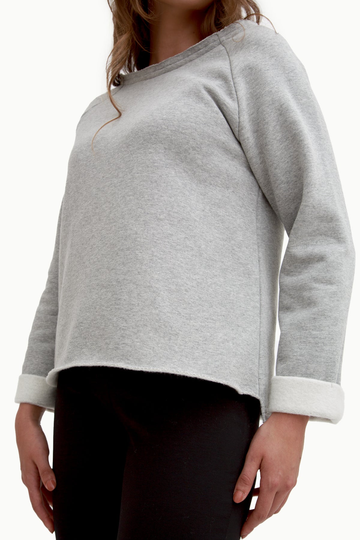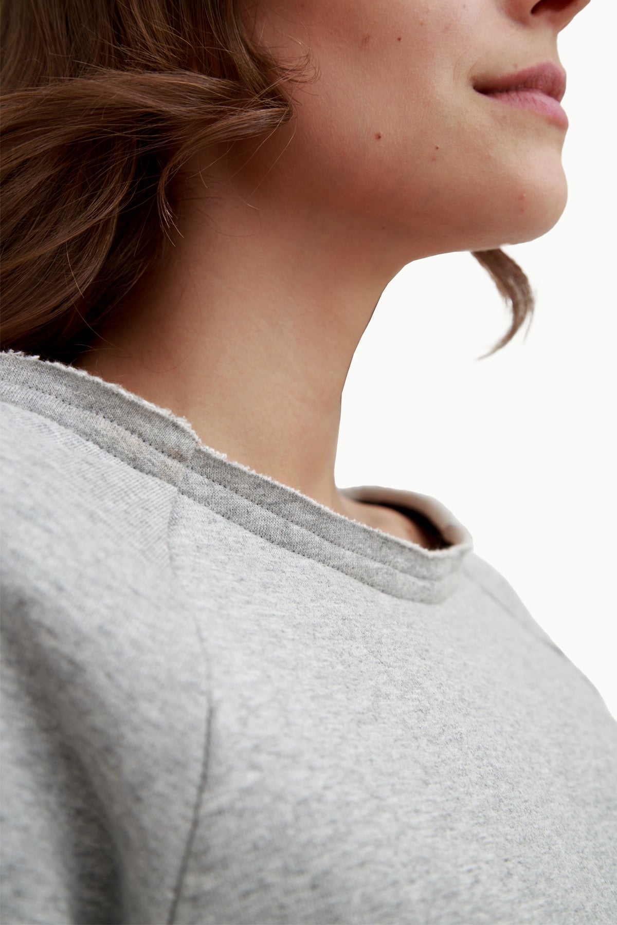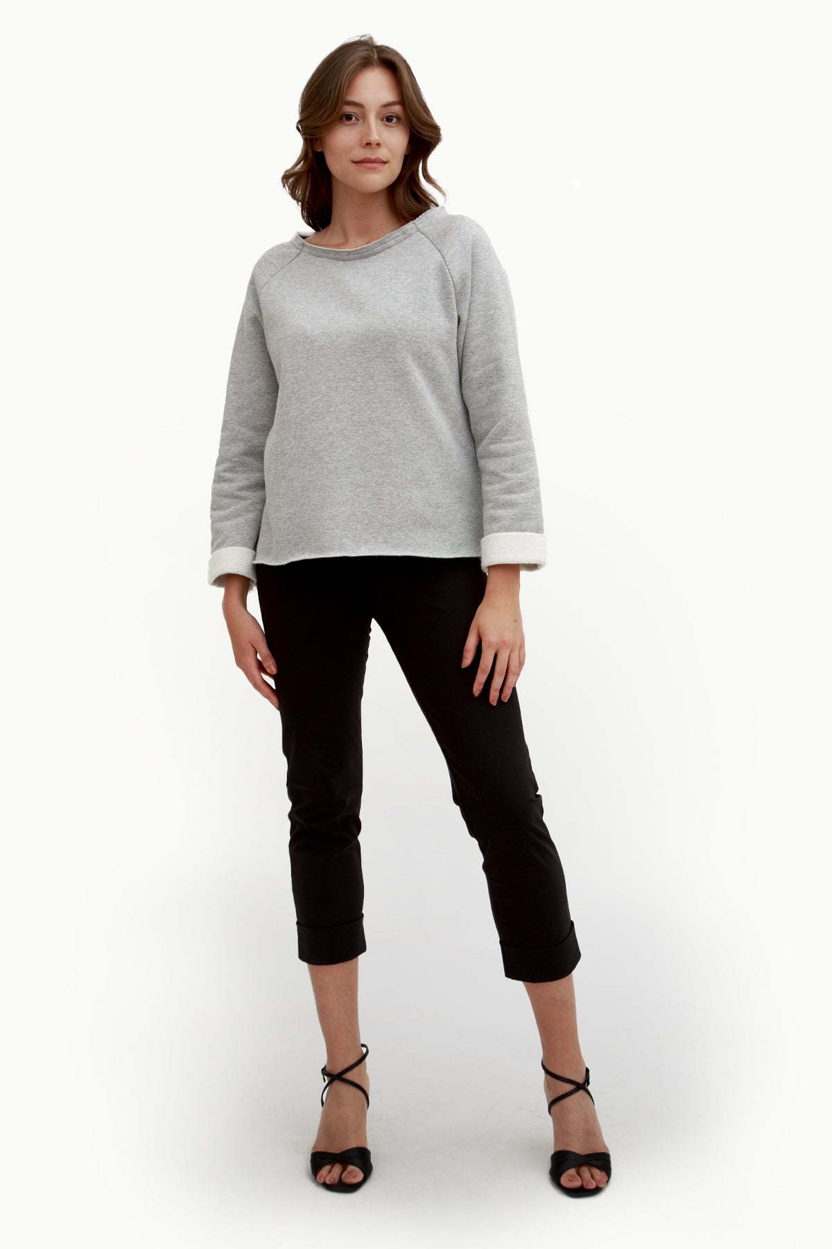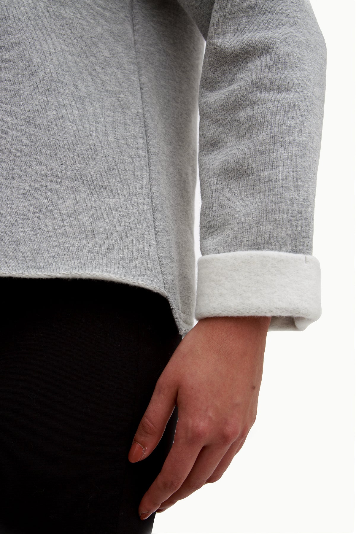 Felpa dal design contemporaneo in morbido grigio melange, caratterizzata da eleganti polsini e orlo a contrasto bianco. Un capo versatile che unisce comfort e stile per un look casual-chic.