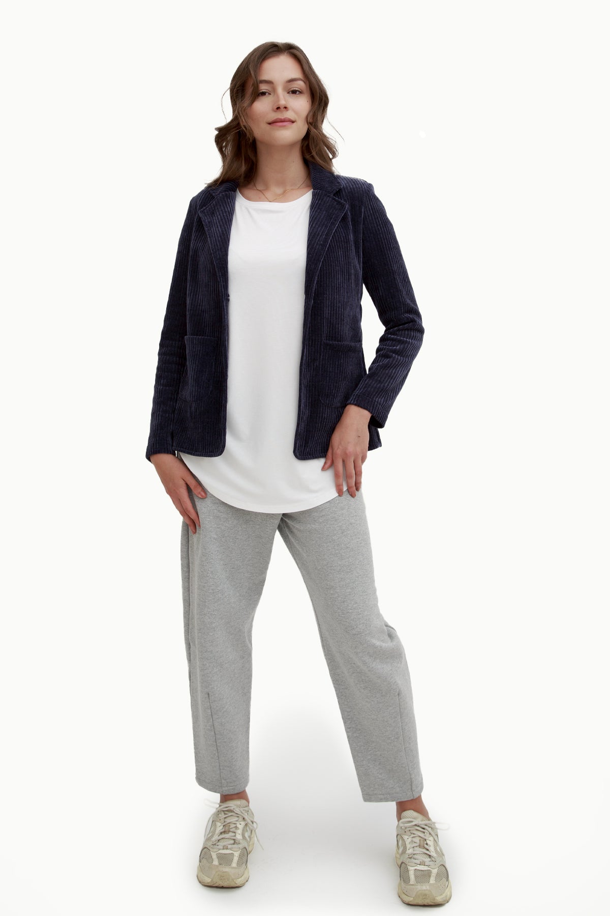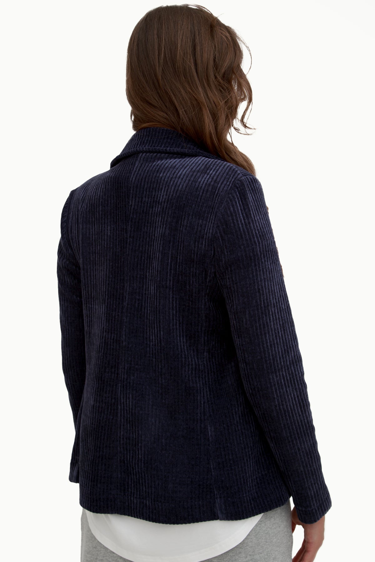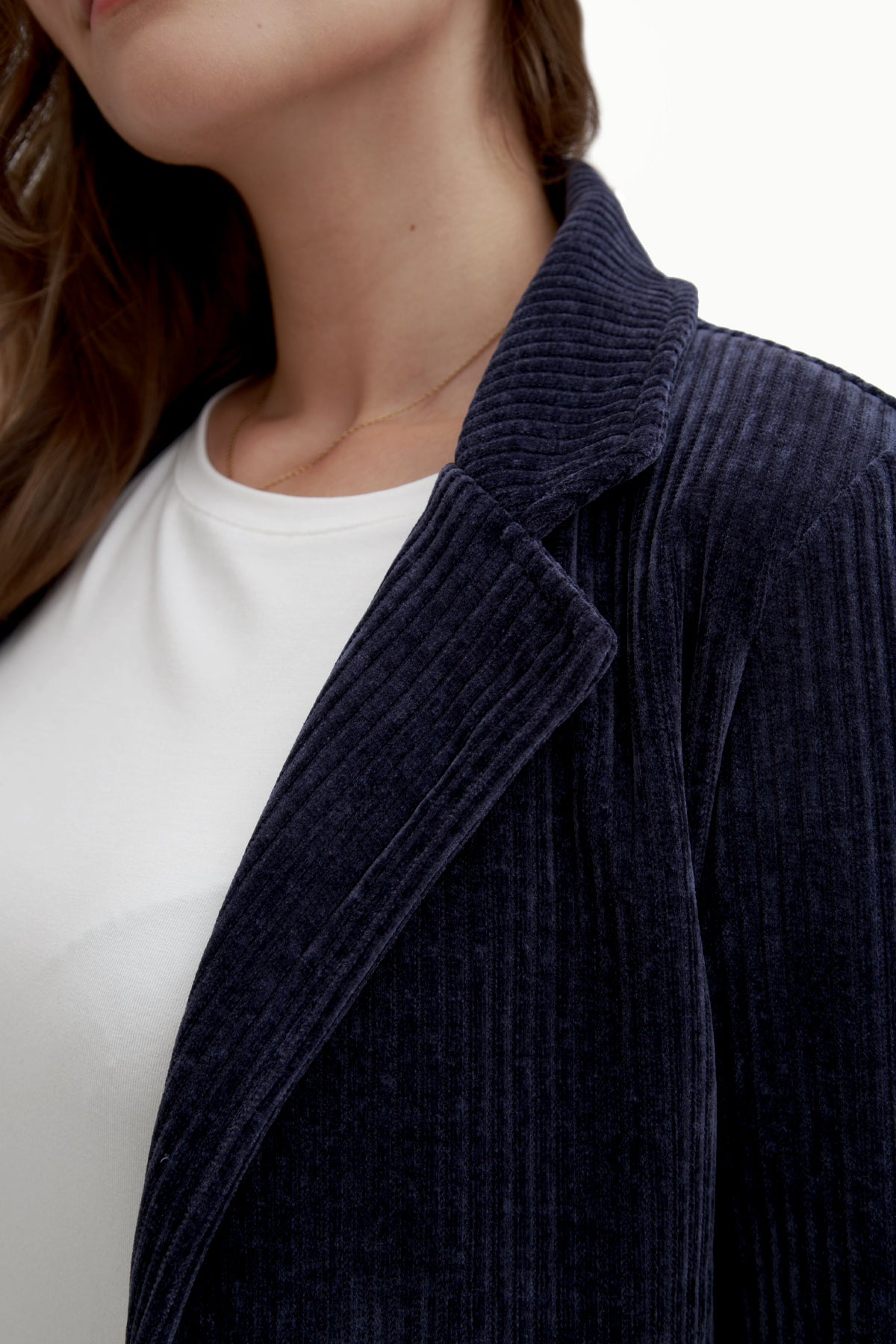 Scopri la raffinata giacca blazer in velluto a coste blu scuro, un capo iconico che unisce l'eleganza del taglio sartoriale italiano alla morbidezza del velluto di alta qualità.