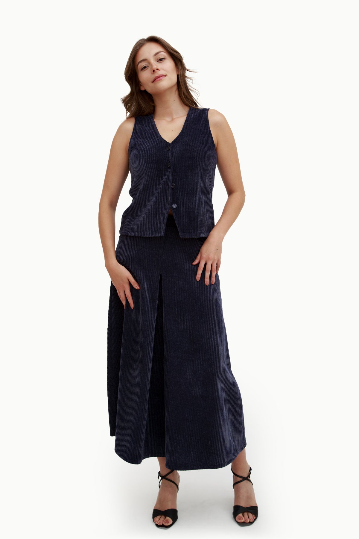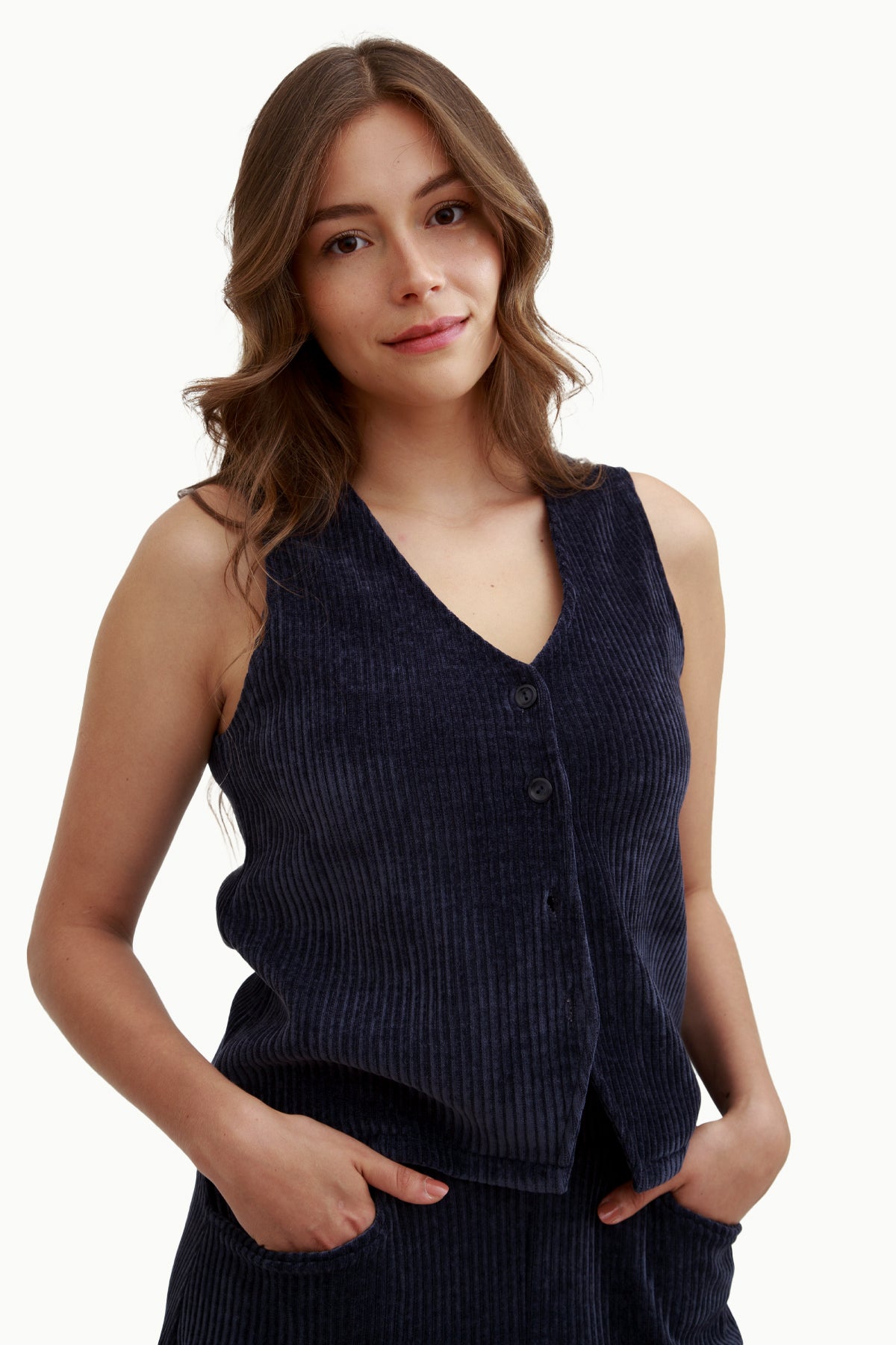 Scopri la raffinata eleganza del gilet donna in velluto a coste blu scuro, un capo versatile che unisce stile contemporaneo e qualità artigianale italiana. Perfetto per creare look sofisticati in ogni stagione.